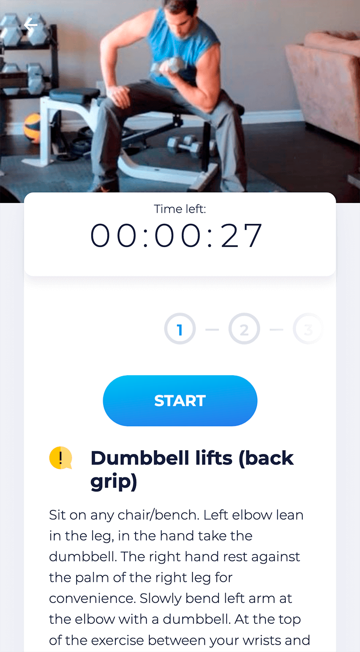 The presence effect in Personal Training mode is achieved through visual, audio and text prompts. For example, the Mobile.Fitness Assistant will show you not only how to perform the exercise correctly, but also when to exert maximum effort and when to pause and rest.